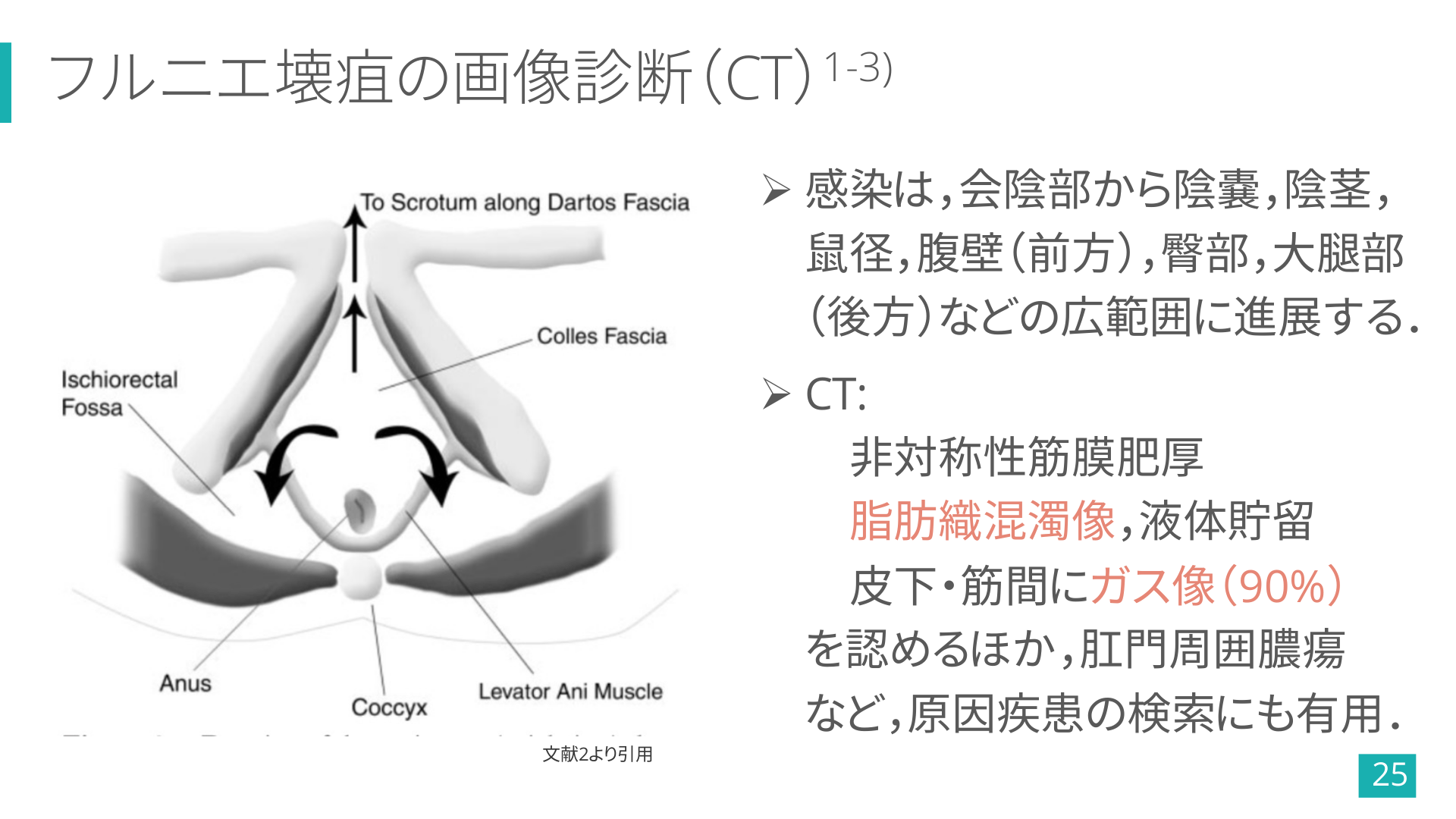 #25. 1-3) フルニエ壊疽の画像診断(CT) Ø 感染は,会陰部から陰嚢,陰茎, 鼠径,腹壁(前方),臀部,大腿部 (後方)などの広範囲に進展する. 文献2より引用 Ø CT: 非対称性筋膜肥厚 脂肪織混濁像,液体貯留 皮下・筋間にガス像(90%) を認めるほか,肛門周囲膿瘍 など,原因疾患の検索にも有用. 25
