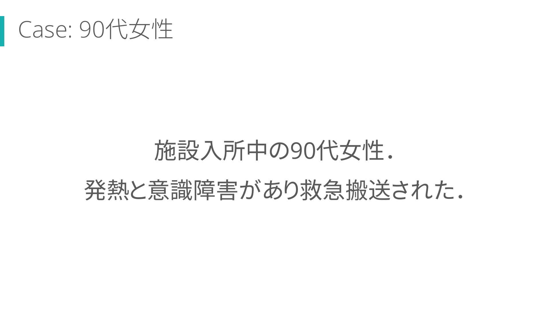 #3. Case: 90代女性 施設入所中の90代女性. 発熱と意識障害があり救急搬送された.