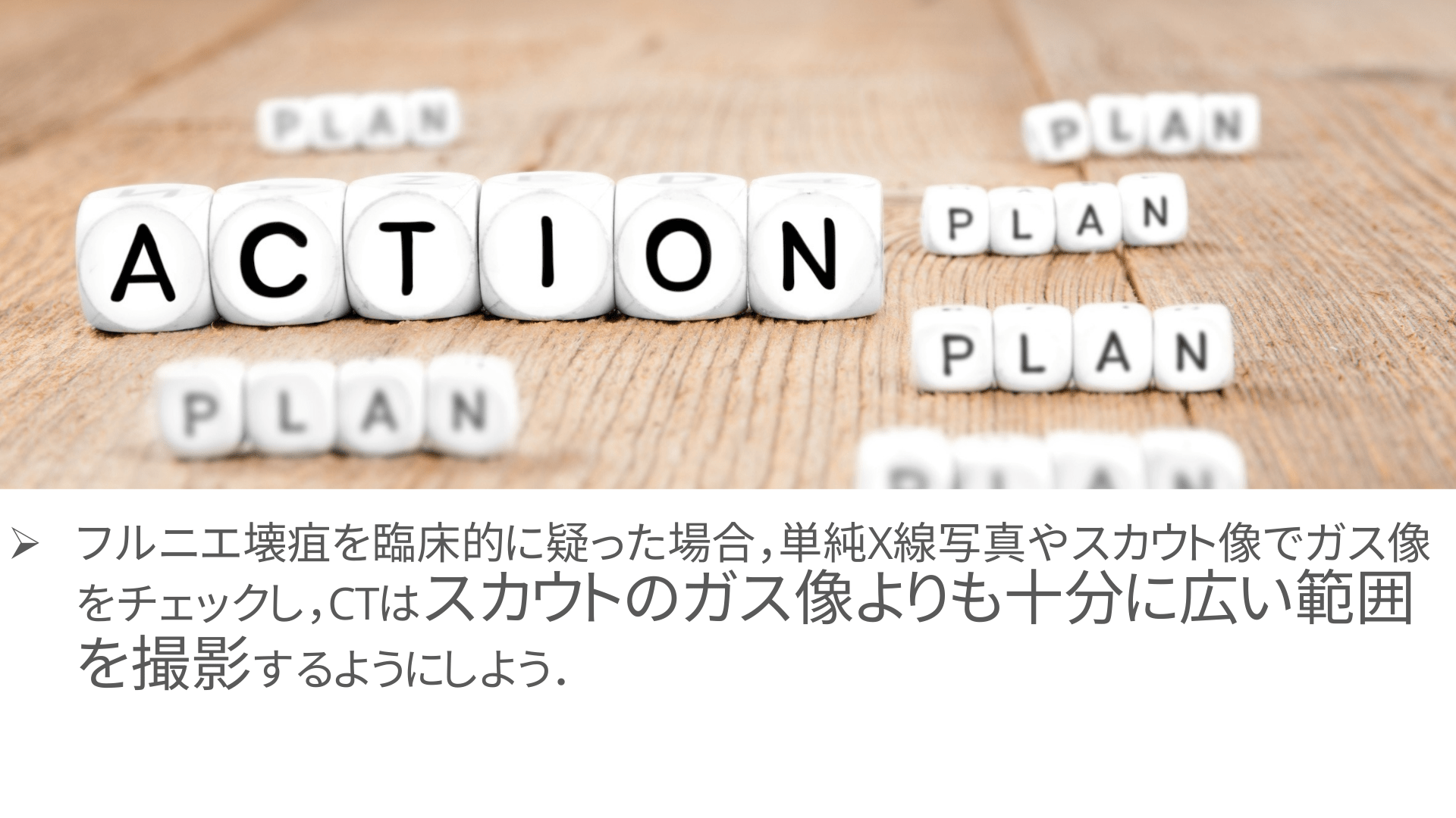 #27. 今回の症例で診断の流れを復習!! スカウト像 会陰部周囲にガス像あり 広めに撮影しておこう!! 27