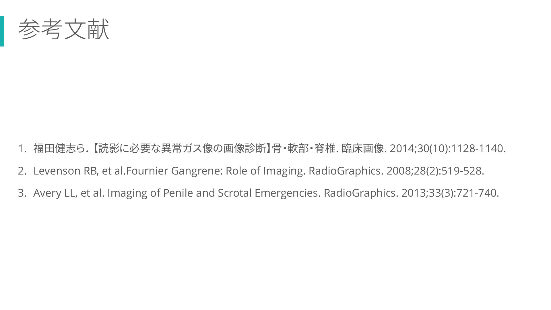 #31. 参考文献 1. 福田健志ら. 【読影に必要な異常ガス像の画像診断】骨・軟部・脊椎. 臨床画像. 2014;30(10):1128-1140. 2. Levenson RB, et al.Fournier Gangrene: Role of Imaging. RadioGraphics. 2008;28(2):519-528. 3. Avery LL, et al. Imaging of Penile and Scrotal Emergencies. RadioGraphics. 2013;33(3):721-740.