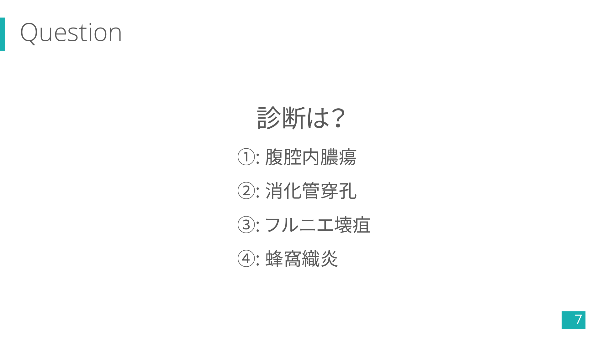 #7. Question 診断は? ①: 腹腔内膿瘍 ②: 消化管穿孔 ③: フルニエ壊疽 ④: 蜂窩織炎 7