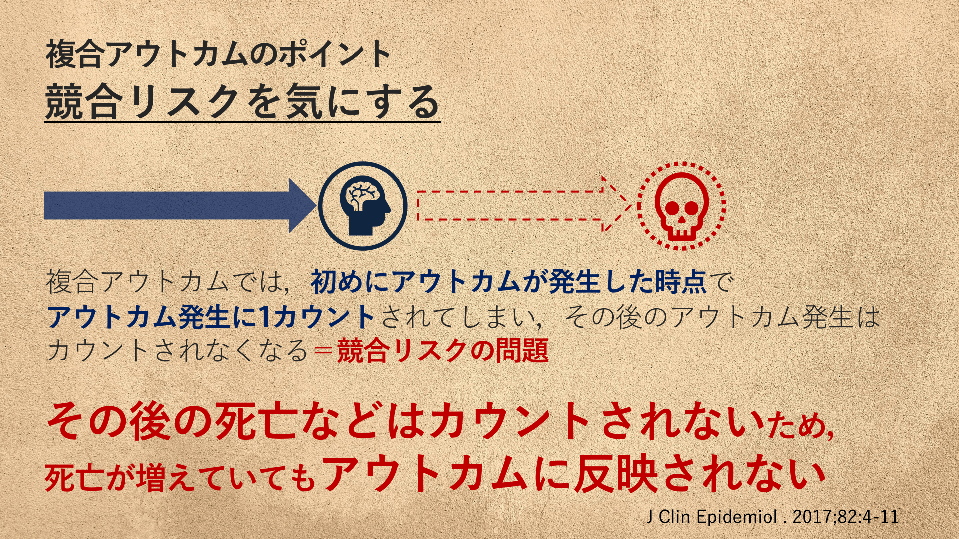 #12. 複合アウトカムのポイント 競合リスクを気にする 複合アウトカムでは,初めにアウトカムが発生した時点で アウトカム発生に カウントされてしまい,その後のアウトカム発生は カウントされなくなる=競合リスクの問題 その後の死亡などはカウントされないため, 死亡が増えていてもアウトカムに反映されない J Clin Epidemiol . 2017;82:4-11