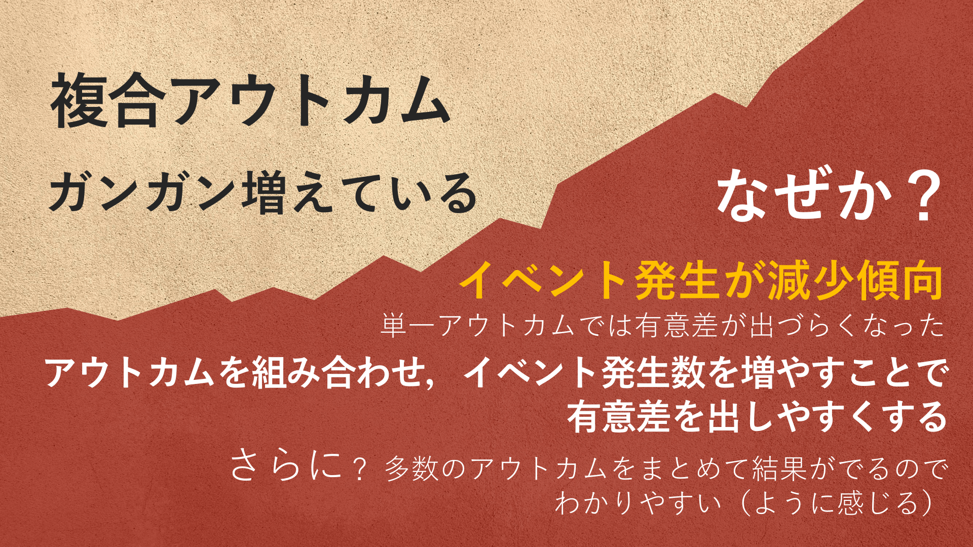 #3. 複合アウトカム ガンガン増えている なぜか? イベント発生が減少傾向 単一アウトカムでは有意差が出づらくなった アウトカムを組み合わせ,イベント発生数を増やすことで 有意差を出しやすくする さらに? 多数のアウトカムをまとめて結果がでるので わかりやすい(ように感じる)