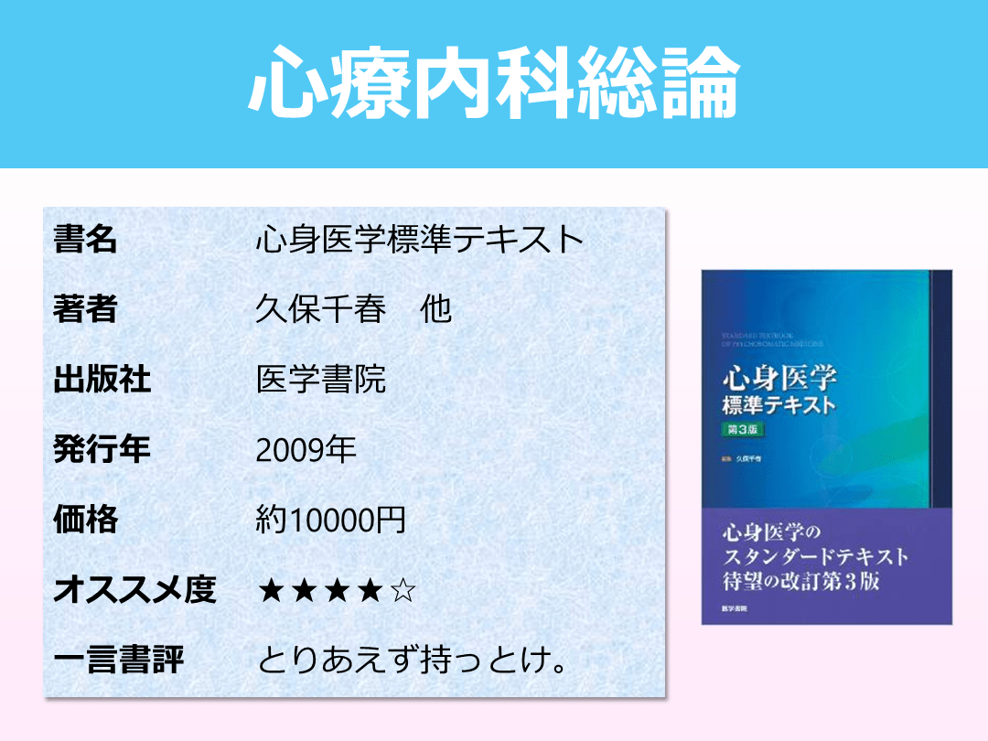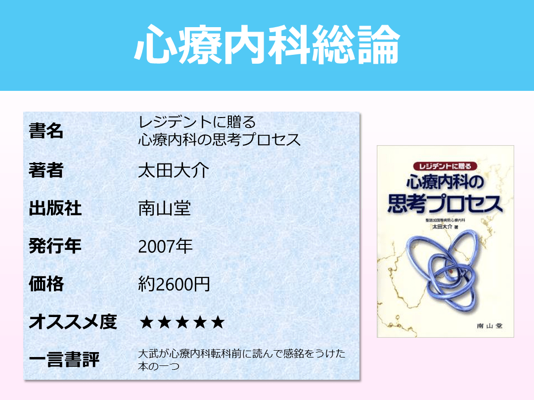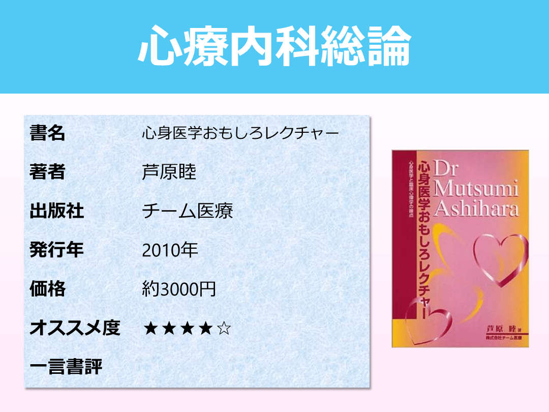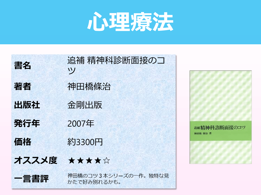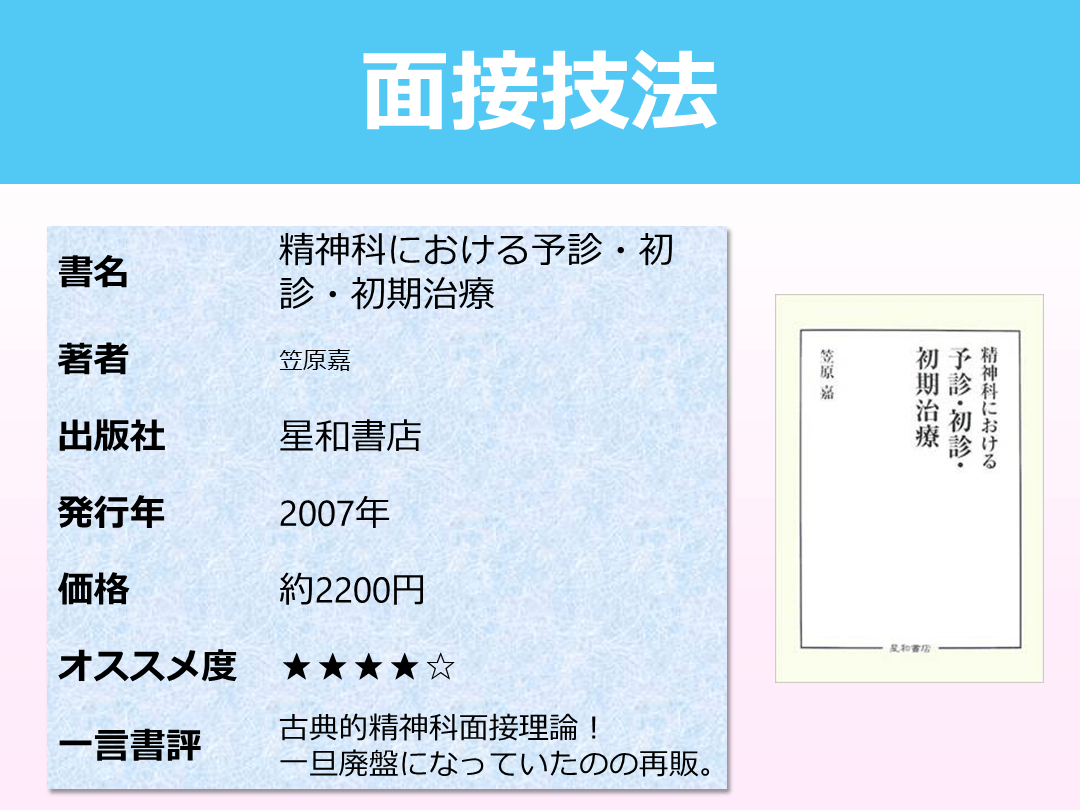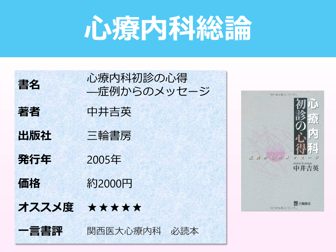 ※私の心療内科研修当時のもので、価格違い、現在絶版(もしくは入手困難)などの書籍が多数あります。またこれ以後6年間でも良い書籍が沢山出てきましたので、またご要望があればまとめます。