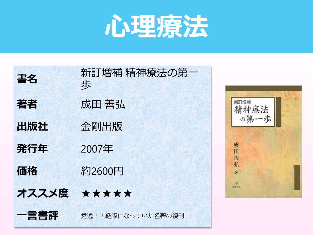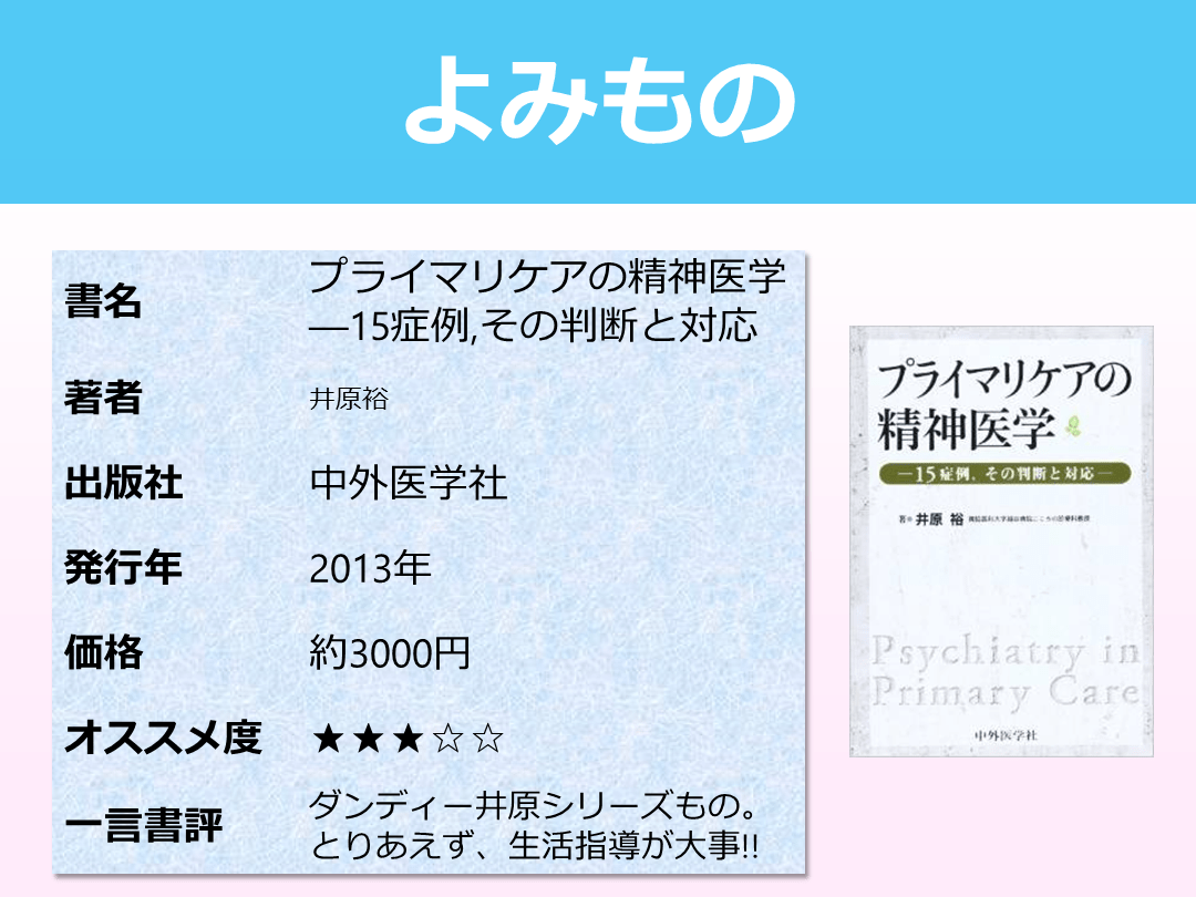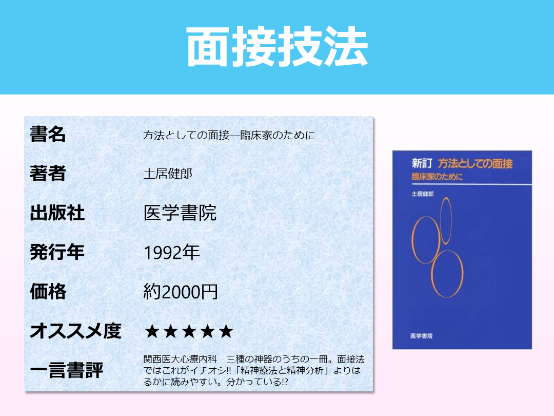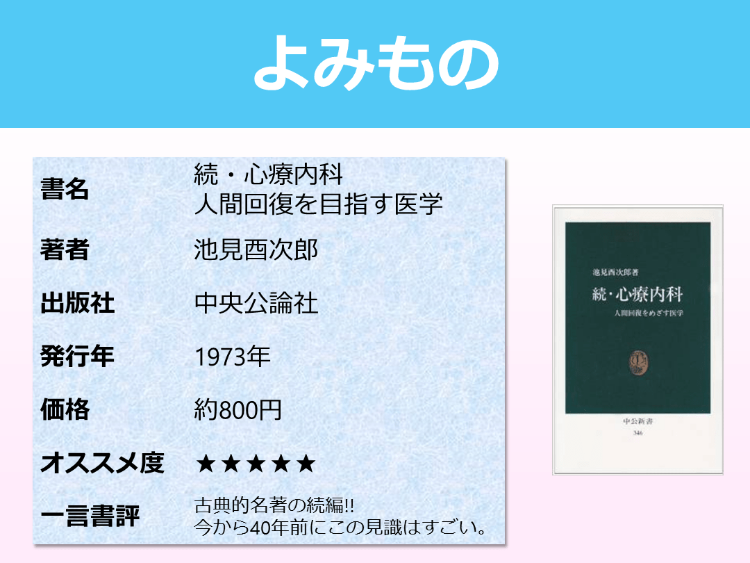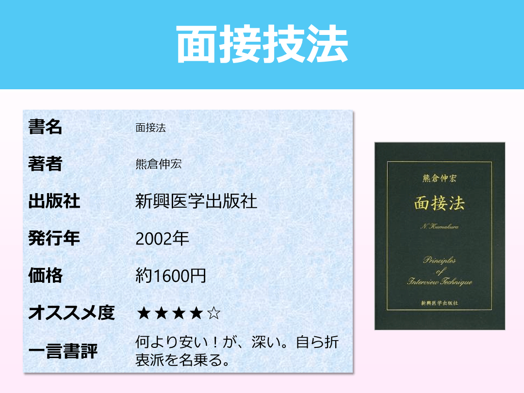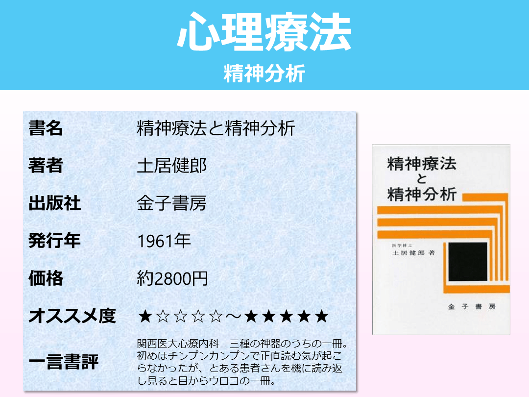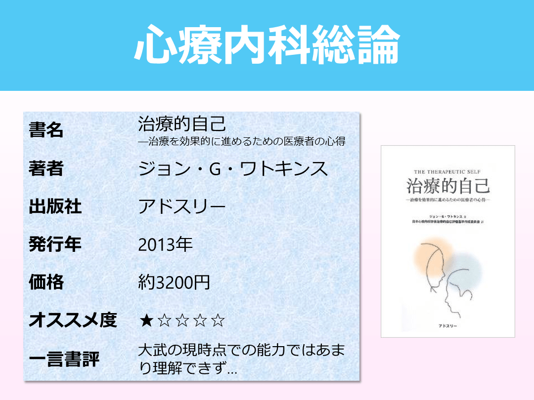 ※私の心療内科研修当時のもので、価格違い、現在絶版(もしくは入手困難)などの書籍が多数あります。またこれ以後6年間でも良い書籍が沢山出てきましたので、またご要望があればまとめます。