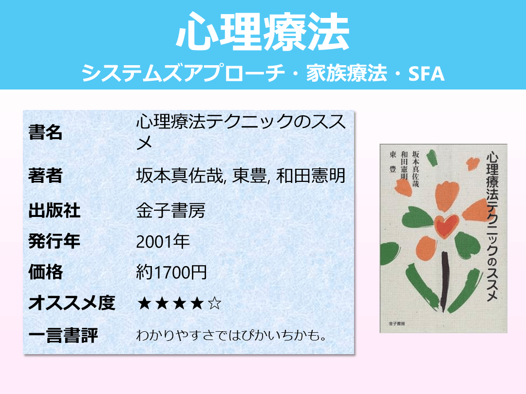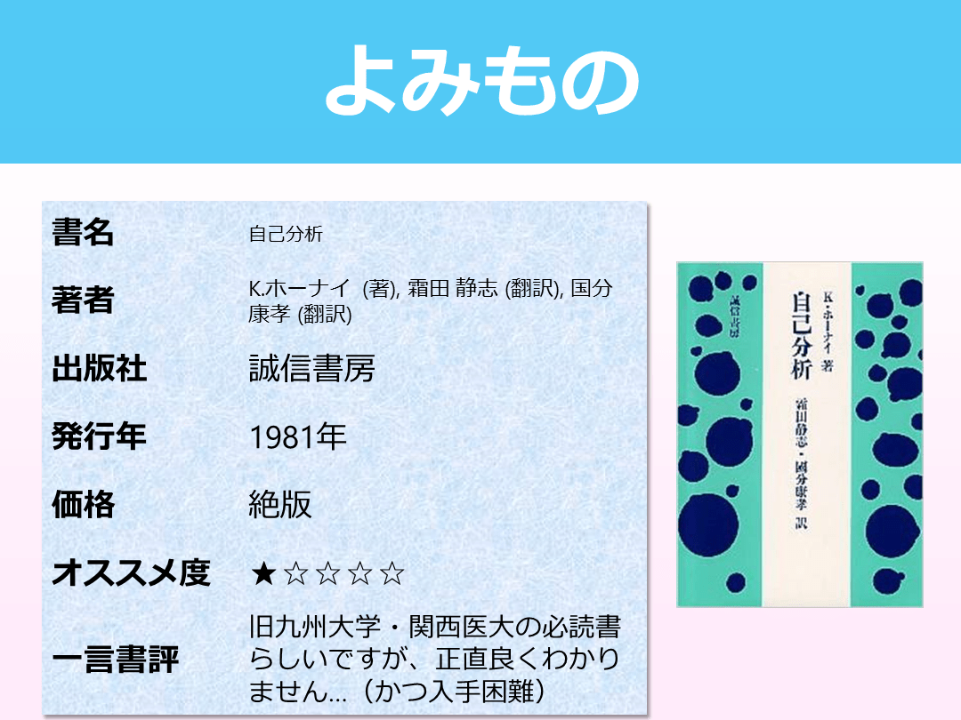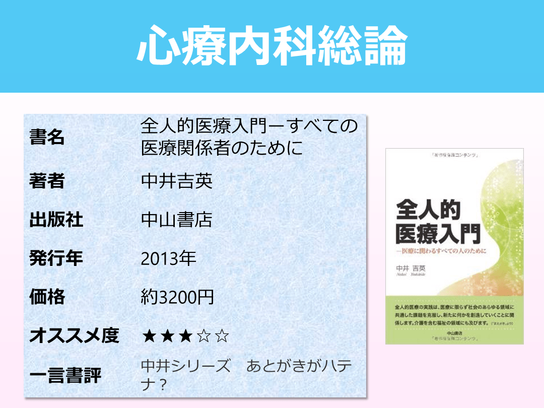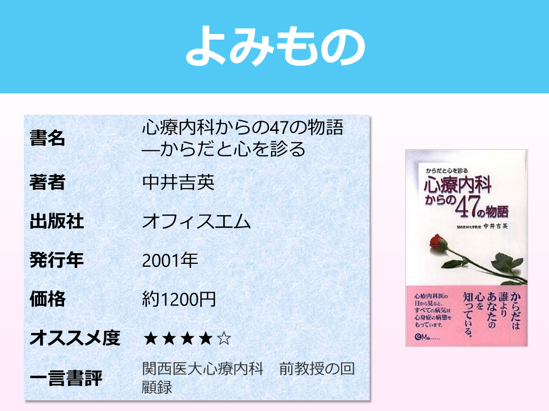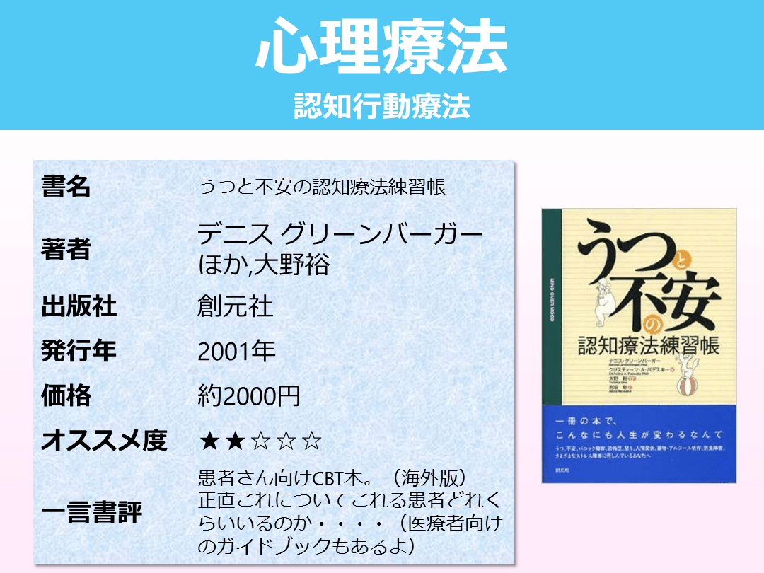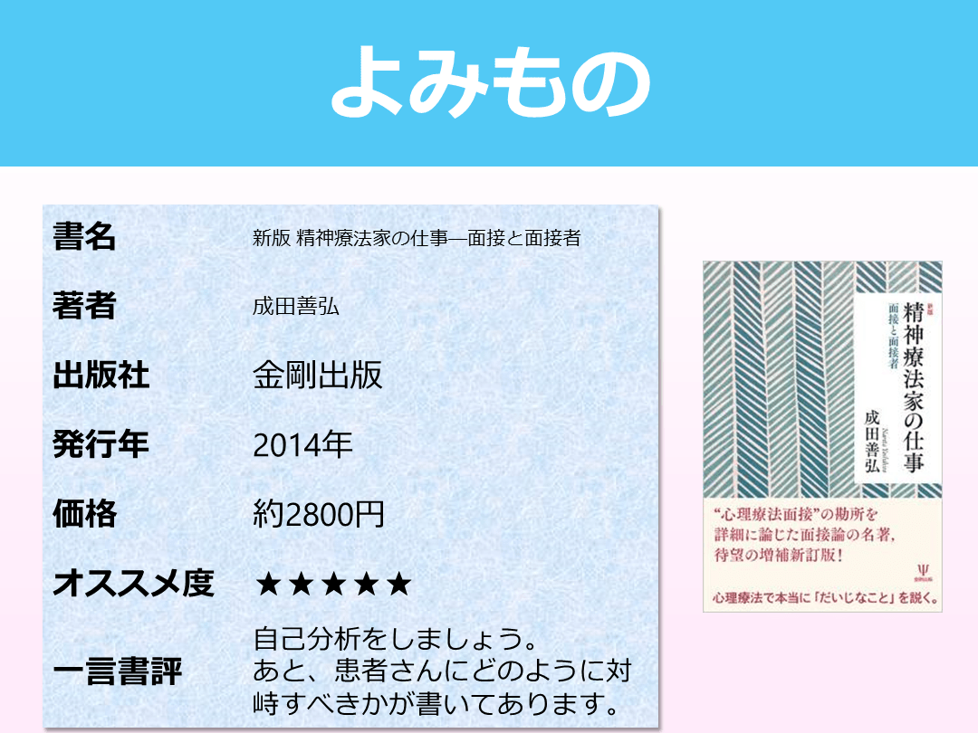 ※私の心療内科研修当時のもので、価格違い、現在絶版(もしくは入手困難)などの書籍が多数あります。またこれ以後6年間でも良い書籍が沢山出てきましたので、またご要望があればまとめます。