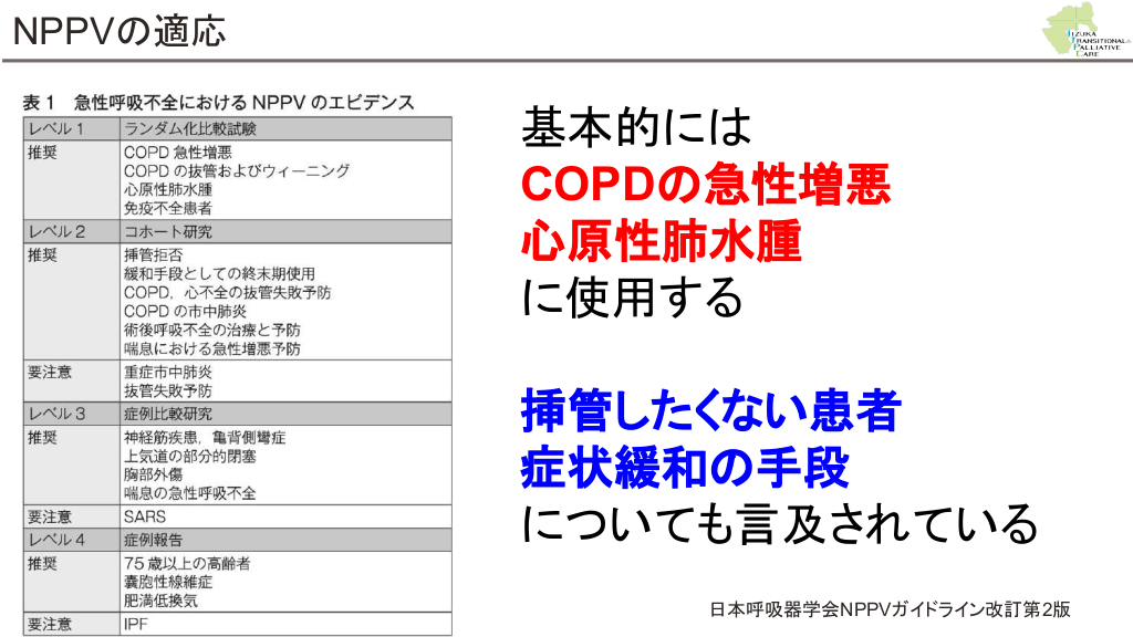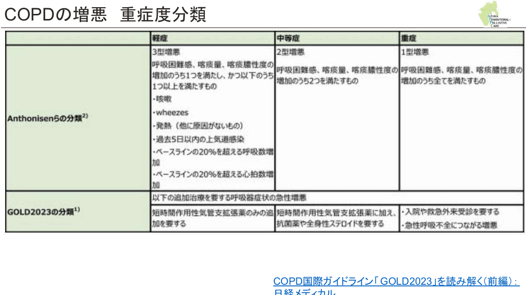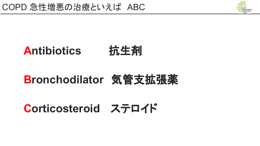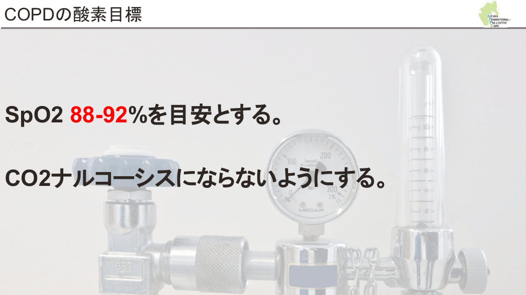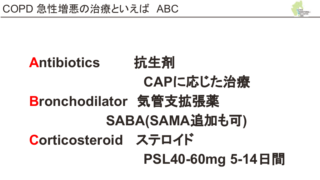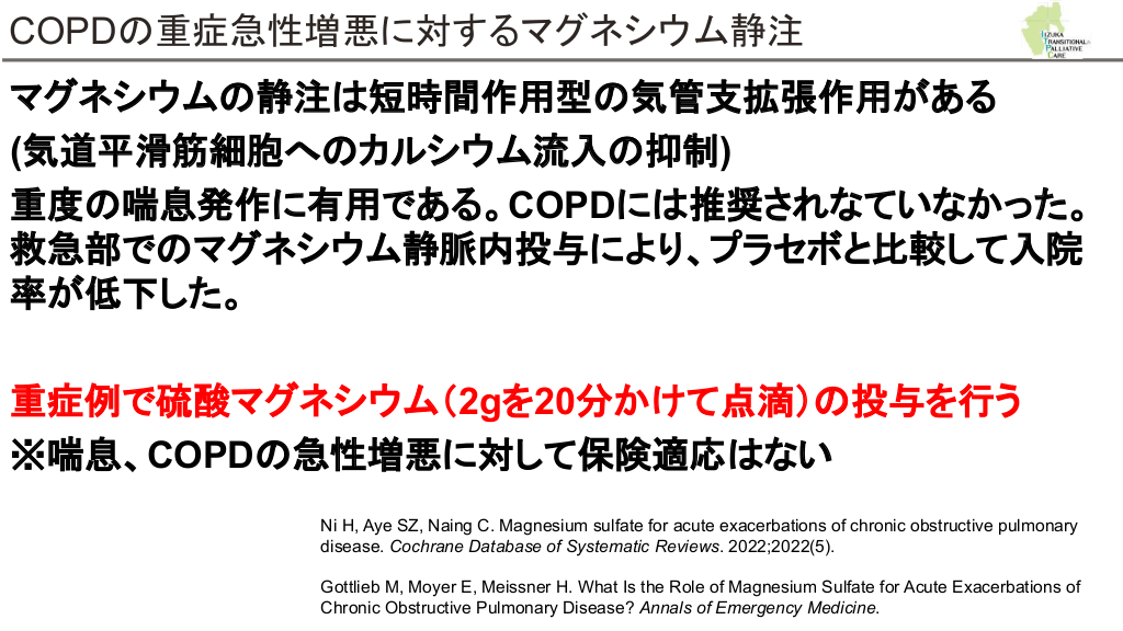 COPD 重症急性増悪に対するマグネシウム静注 マグネシウム 静注 短時間作用型 気管支拡張作用がある (気道平滑筋細胞へ カルシウム流入 抑制) 重度 喘息発作に有用である。COPDに 推奨されなていなかった。 救急部で マグネシウム静脈内投与により、プラセボと比較して入院 率が低下した。 重症例で硫酸マグネシウム(2gを20分かけて点滴) 投与を行う ※喘息、COPD 急性増悪に対して保険適応 ない Ni H, Aye SZ, Naing C. Magnesium sulfate for acute exacerbations of chronic obstructive pulmonary disease. Cochrane Database of Systematic Reviews. 2022;2022(5). Gottlieb M, Moyer E, Meissner H. What Is the Role of Magnesium Sulfate for Acute Exacerbations of Chronic Obstructive Pulmonary Disease? Annals of Emergency Medicine.