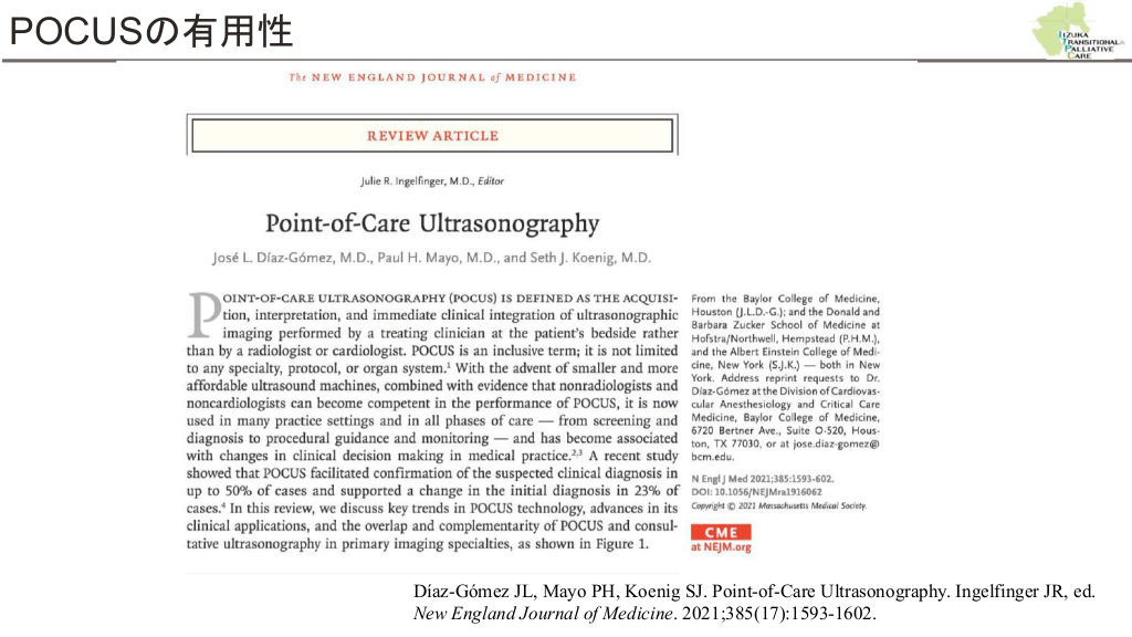 POCUS 有用性 Díaz-Gómez JL, Mayo PH, Koenig SJ. Point-of-Care Ultrasonography. Ingelfinger JR, ed. New England Journal of Medicine. 2021;385(17):1593-1602.