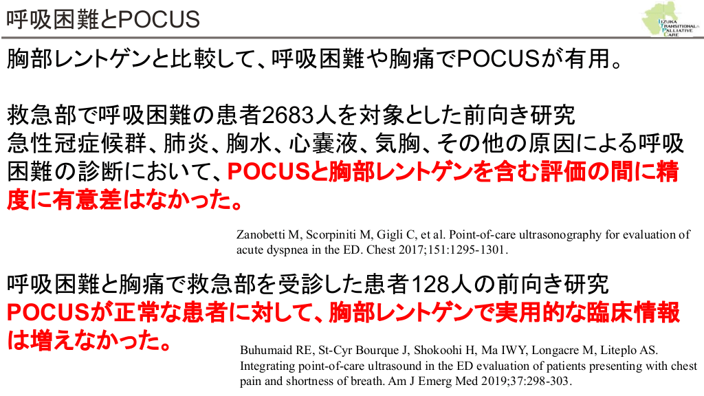 呼吸困難とPOCUS 胸部レントゲンと比較して、呼吸困難や胸痛でPOCUSが有用。 救急部で呼吸困難 患者2683人を対象とした前向き研究 急性冠症候群、肺炎、胸水、心嚢液、気胸、そ 他 原因による呼吸 困難 診断において、POCUSと胸部レントゲンを含む評価 間に精 度に有意差 なかった。 Zanobetti M, Scorpiniti M, Gigli C, et al. Point-of-care ultrasonography for evaluation of acute dyspnea in the ED. Chest 2017;151:1295-1301. 呼吸困難と胸痛で救急部を受診した患者128人 前向き研究 POCUSが正常な患者に対して、胸部レントゲンで実用的な臨床情報 増えなかった。 Buhumaid RE, St-Cyr Bourque J, Shokoohi H, Ma IWY, Longacre M, Liteplo AS. Integrating point-of-care ultrasound in the ED evaluation of patients presenting with chest pain and shortness of breath. Am J Emerg Med 2019;37:298-303.