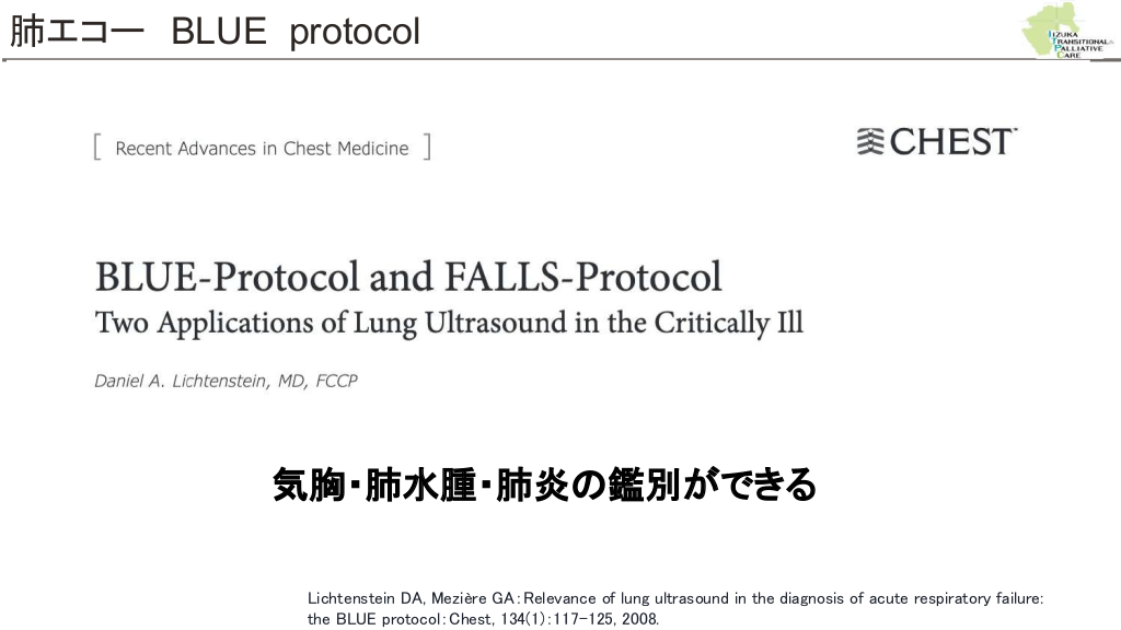 肺エコー BLUE protocol 気胸・肺水腫・肺炎 鑑別ができる Lichtenstein DA, Mezière GA: elevance of lung ultrasound in the diagnosis of acute respiratory failure: the BL E protocol:Chest, 134(1):117-125, 2008.