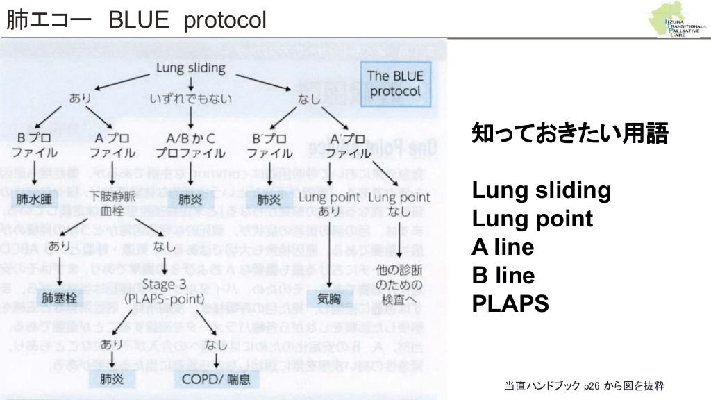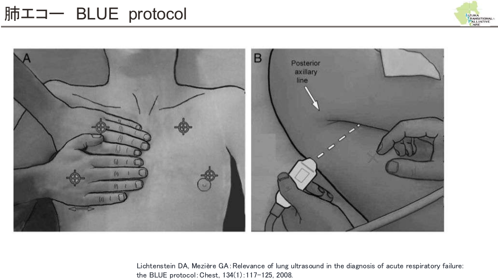 肺エコー BLUE protocol Lichtenstein DA, Mezière GA: elevance of lung ultrasound in the diagnosis of acute respiratory failure: the BL E protocol:Chest, 134(1):117-125, 2008.