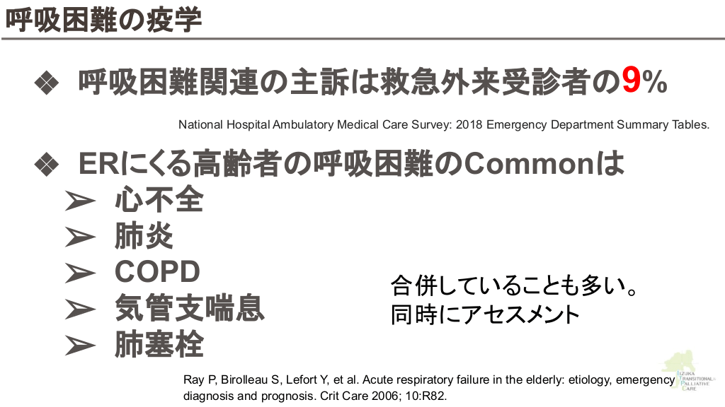 呼吸困難 疫学 ❖ 呼吸困難関連 主訴 救急外来受診者 9% National Hospital Ambulatory Medical Care Survey: 2018 Emergency Department Summary Tables. ❖ ERにくる高齢者 ➢ 心不全 ➢ 肺炎 ➢ COPD ➢ 気管支喘息 ➢ 肺塞栓 呼吸困難 Common 合併していることも多い。 同時にアセスメント Ray P, Birolleau S, Lefort Y, et al. Acute respiratory failure in the elderly: etiology, emergency diagnosis and prognosis. Crit Care 2006; 10:R82.