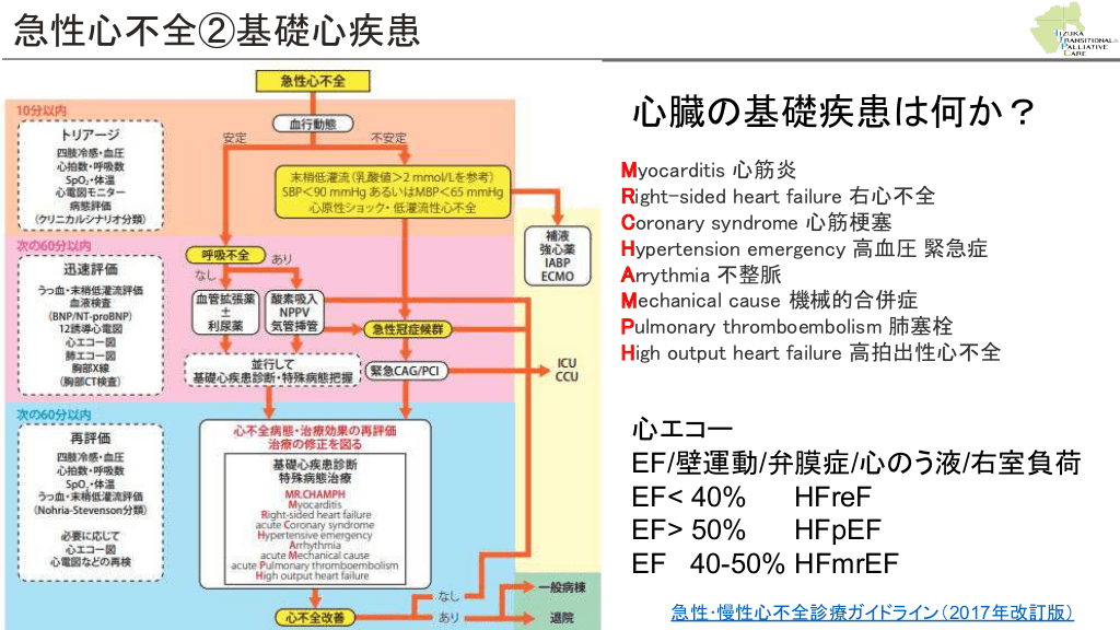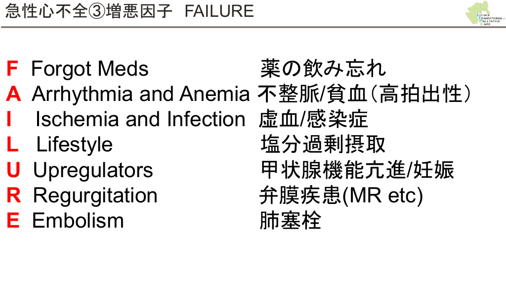 急性心不全③増悪因子 FAILURE F A I L U R E Forgot Meds 薬 飲み忘れ Arrhythmia and Anemia 不整脈/貧血(高拍出性) Ischemia and Infection 虚血/感染症 Lifestyle 塩分過剰摂取 Upregulators 甲状腺機能亢進/妊娠 Regurgitation 弁膜疾患(MR etc) Embolism 肺塞栓