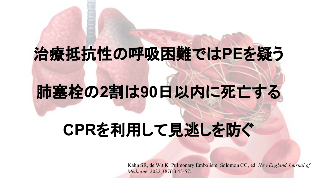 治療抵抗性 肺塞栓 呼吸困難で PEを疑う 2割 90日以内に死亡する CPRを利用して見逃しを防ぐ Kahn SR, de Wit K. Pulmonary Embolism. Solomon CG, ed. New England Journal of Medicine. 2022;387(1):45-57.