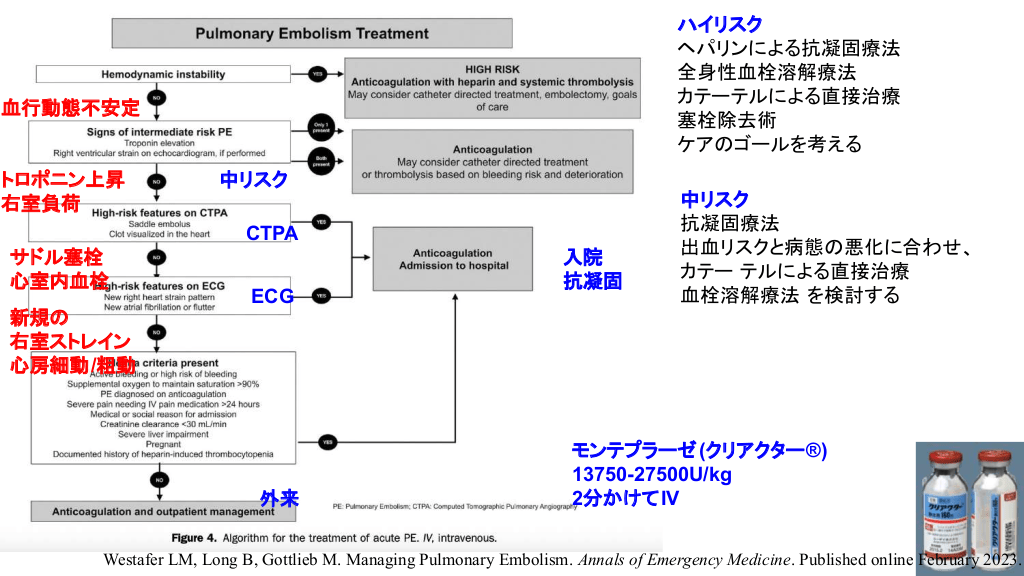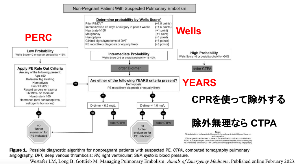 PERC Wells YEARS CPRを使って除外する 除外無理なら CTPA Westafer LM, Long B, Gottlieb M. Managing Pulmonary Embolism. Annals of Emergency Medicine. Published online February 2023.