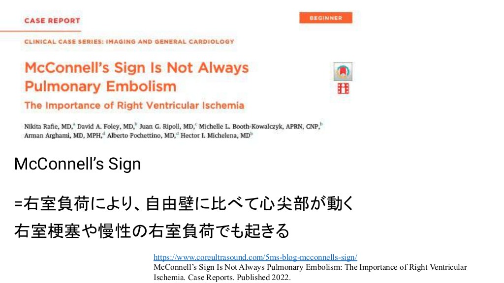 McConnell’s Sign =右室負荷により、自由壁に比べて心尖部が動く 右室梗塞や慢性 右室負荷でも起きる https://www.coreultrasound.com/5ms-blog-mcconnells-sign/ McConnell’s Sign Is Not Always Pulmonary Embolism: The Importance of Right Ventricular Ischemia. Case Reports. Published 2022.