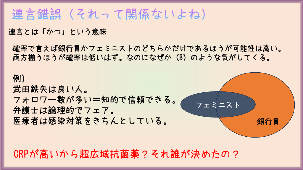 #10. 連言錯誤(それって関係ないよね) 連言とは「かつ」という意味 確率で言えば銀行員かフェミニストのどちらかだけであるほうが可能性は高い。 両方揃うほうが確率は低いはず。なのになぜか(B)のような気がしてくる。 例) 武田鉄矢は良い人。 フォロワー数が多い=知的で信頼できる。 弁護士は論理的でフェア。 医療者は感染対策をきちんとしている。 フェミニスト CRPが高いから超広域抗菌薬?それ誰が決めたの? 銀行員