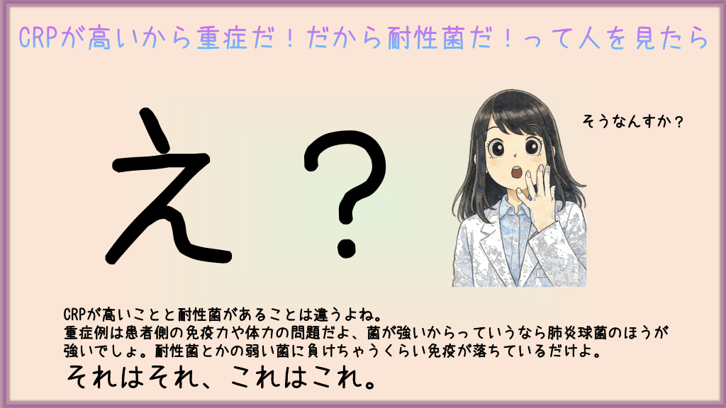 #11. CRPが高いから重症だ!だから耐性菌だ!って人を見たら そうなんすか? CRPが高いことと耐性菌があることは違うよね。 重症例は患者側の免疫力や体力の問題だよ、菌が強いからっていうなら肺炎球菌のほうが 強いでしょ。耐性菌とかの弱い菌に負けちゃうくらい免疫が落ちているだけよ。 それはそれ、これはこれ。