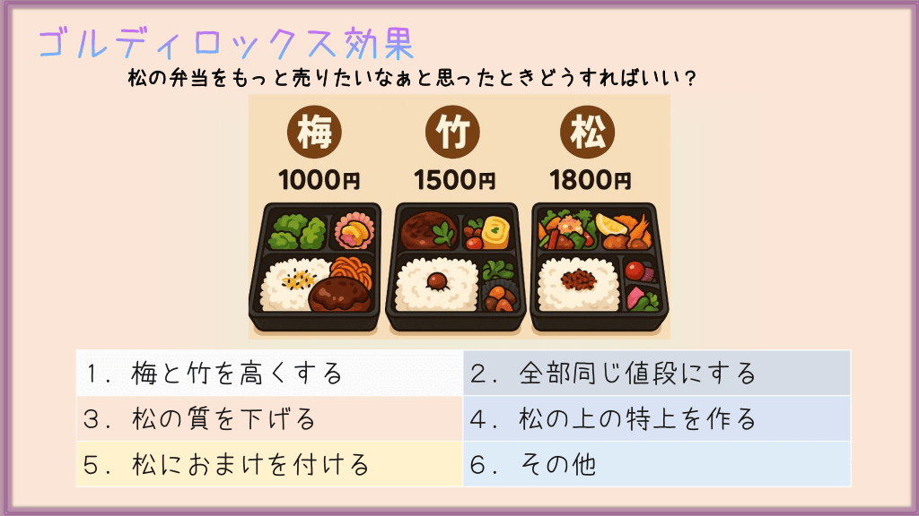 #13. ゴルディロックス効果 松の弁当をもっと売りたいなぁと思ったときどうすればいい? 1.梅と竹を高くする 2.全部同じ値段にする 3.松の質を下げる 4.松の上の特上を作る 5.松におまけを付ける 6.その他