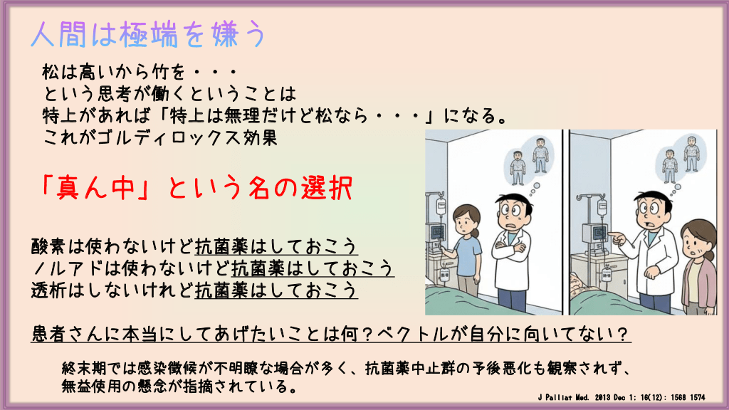 #14. 人間は極端を嫌う 松は高いから竹を・・・ という思考が働くということは 特上があれば「特上は無理だけど松なら・・・」になる。 これがゴルディロックス効果 「真ん中」という名の選択 酸素は使わないけど抗菌薬はしておこう ノルアドは使わないけど抗菌薬はしておこう 透析はしないけれど抗菌薬はしておこう 患者さんに本当にしてあげたいことは何?ベクトルが自分に向いてない? 終末期では感染徴候が不明瞭な場合が多く、抗菌薬中止群の予後悪化も観察されず、 無益使用の懸念が指摘されている。 J Palliat Med. 2013 Dec 1; 16(12): 1568 1574
