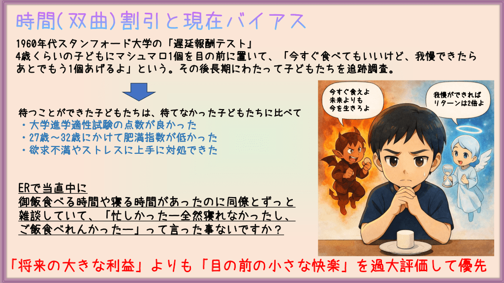 #17. 時間(双曲)割引と現在バイアス 1960年代スタンフォード大学の「遅延報酬テスト」 4歳くらいの子どもにマシュマロ1個を目の前に置いて、「今すぐ食べてもいいけど、我慢できたら あとでもう1個あげるよ」という。その後長期にわたって子どもたちを追跡調査。 待つことができた子どもたちは、待てなかった子どもたちに比べて 今すぐ食えよ 未来よりも 今を生きろよ 我慢ができれば リターンは2倍よ ・大学進学適性試験の点数が良かった ・27歳~32歳にかけて肥満指数が低かった ・欲求不満やストレスに上手に対処できた ERで当直中に 御飯食べる時間や寝る時間があったのに同僚とずっと 雑談していて、「忙しかったー全然寝れなかったし、 ご飯食べれんかったー」って言った事ないですか? 「将来の大きな利益」よりも「目の前の小さな快楽」を過大評価して優先