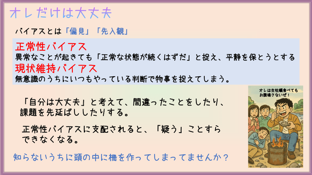 #19. オレだけは大丈夫 バイアスとは「偏見」「先入観」 正常性バイアス 異常なことが起きても「正常な状態が続くはずだ」と捉え、平静を保とうとする 現状維持バイアス 無意識のうちにいつもやっている判断で物事を捉えてしまう。 オレは生牡蠣食べても お腹壊さないぜ! 「自分は大丈夫」と考えて、間違ったことをしたり、 課題を先延ばししたりする。 正常性バイアスに支配されると、「疑う」ことすら できなくなる。 知らないうちに頭の中に柵を作ってしまってませんか?
