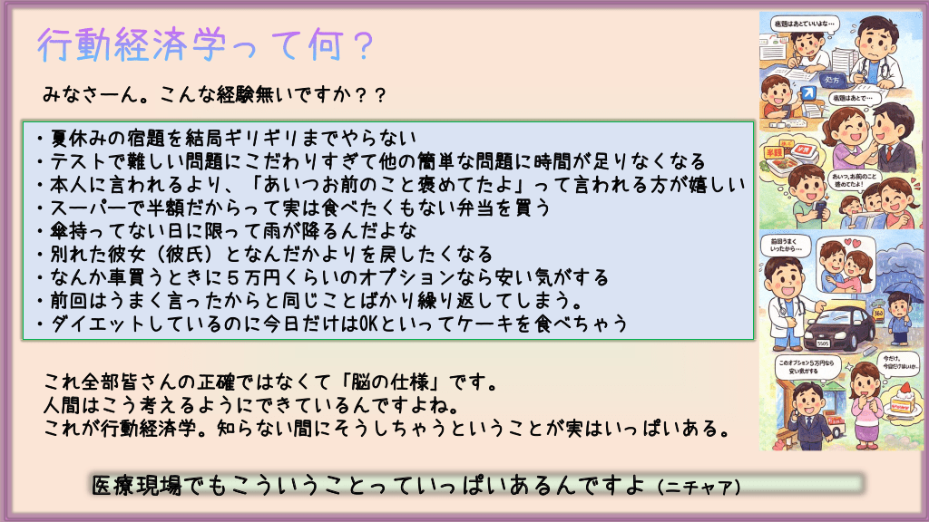 #2. 行動経済学って何? みなさーん。こんな経験無いですか?? ・夏休みの宿題を結局ギリギリまでやらない ・テストで難しい問題にこだわりすぎて他の簡単な問題に時間が足りなくなる ・本人に言われるより、「あいつお前のこと褒めてたよ」って言われる方が嬉しい ・スーパーで半額だからって実は食べたくもない弁当を買う ・傘持ってない日に限って雨が降るんだよな ・別れた彼女(彼氏)となんだかよりを戻したくなる ・なんか車買うときに5万円くらいのオプションなら安い気がする ・前回はうまく言ったからと同じことばかり繰り返してしまう。 ・ダイエットしているのに今日だけはOKといってケーキを食べちゃう これ全部皆さんの正確ではなくて「脳の仕様」です。 人間はこう考えるようにできているんですよね。 これが行動経済学。知らない間にそうしちゃうということが実はいっぱいある。 医療現場でもこういうことっていっぱいあるんですよ(ニチャア)