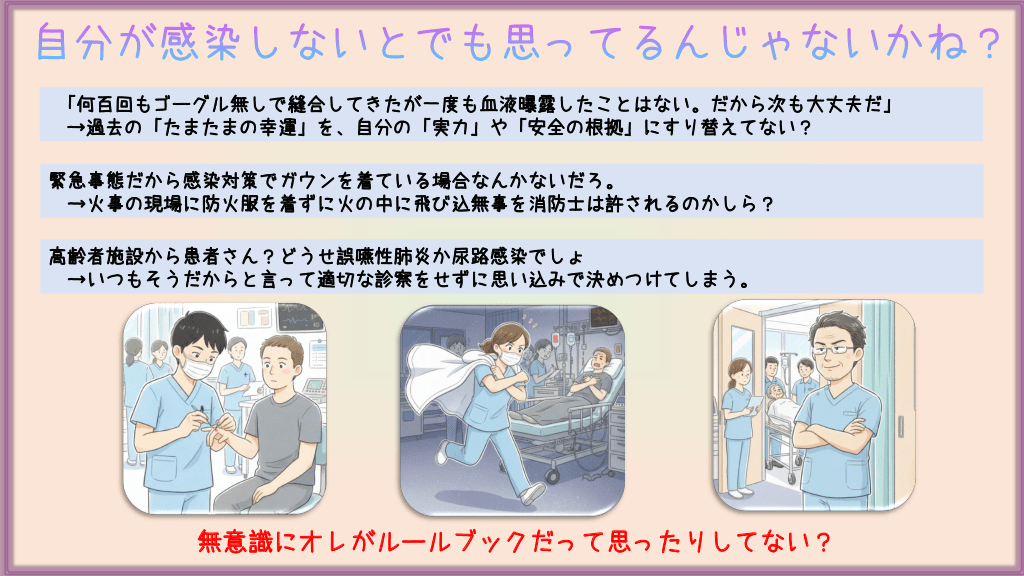 #20. 自分が感染しないとでも思ってるんじゃないかね? 「何百回もゴーグル無しで縫合してきたが一度も血液曝露したことはない。だから次も大丈夫だ」 →過去の「たまたまの幸運」を、自分の「実力」や「安全の根拠」にすり替えてない? 緊急事態だから感染対策でガウンを着ている場合なんかないだろ。 →火事の現場に防火服を着ずに火の中に飛び込無事を消防士は許されるのかしら? 高齢者施設から患者さん?どうせ誤嚥性肺炎か尿路感染でしょ →いつもそうだからと言って適切な診察をせずに思い込みで決めつけてしまう。 無意識にオレがルールブックだって思ったりしてない?