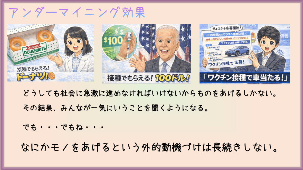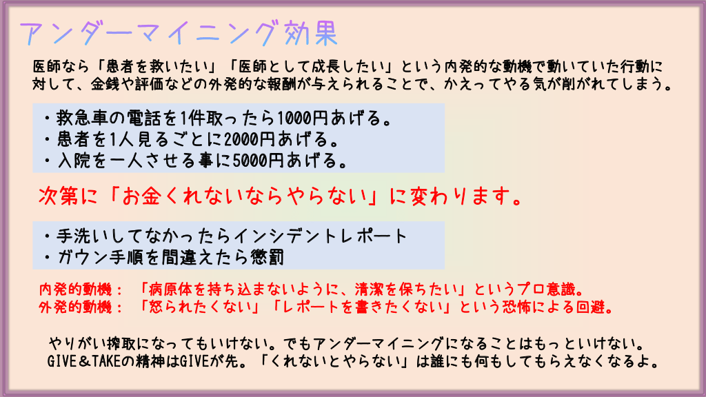 #23. アンダーマイニング効果 医師なら「患者を救いたい」「医師として成長したい」という内発的な動機で動いていた行動に 対して、金銭や評価などの外発的な報酬が与えられることで、かえってやる気が削がれてしまう。 ・救急車の電話を1件取ったら1000円あげる。 ・患者を1人見るごとに2000円あげる。 ・入院を一人させる事に5000円あげる。 次第に「お金くれないならやらない」に変わります。 ・手洗いしてなかったらインシデントレポート ・ガウン手順を間違えたら懲罰 内発的動機: 「病原体を持ち込まないように、清潔を保ちたい」というプロ意識。 外発的動機: 「怒られたくない」「レポートを書きたくない」という恐怖による回避。 やりがい搾取になってもいけない。でもアンダーマイニングになることはもっといけない。 GIVE&TAKEの精神はGIVEが先。「くれないとやらない」は誰にも何もしてもらえなくなるよ。