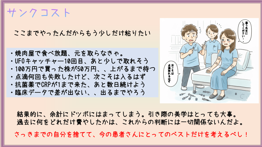 #25. サンクコスト し違 てう く先 だ生 さに い ・ ・ ここまでやったんだからもう少しだけ粘りたい ・焼肉屋で食べ放題、元を取らなきゃ。 ・UFOキャッチャー10回目、あと少しで取れそう ・100万円で買った株が50万円、、上がるまで待つ ・点滴何回も失敗したけど、次こそは入るはず ・抗菌薬でCRPが1まで来た、あと数日続けよう ・臨床データで差が出ない、、出るまでやろう 点次 滴こ 取そ れは る は ず 結果的に、余計にドツボにはまってしまう。引き際の美学はとっても大事。 過去に何をどれだけ費やしたかは、これからの判断には一切関係ないんだよ。 さっきまでの自分を捨てて、今の患者さんにとってのベストだけを考えるべし!