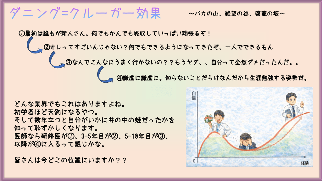 #27. ダニング=クルーガー効果 ~バカの山、絶望の谷、啓蒙の坂~ ①最初は誰もが新人さん。何でもかんでも吸収していっぱい頑張るぞ! ②オレってすごいんじゃない?何でもできるようになってきたぞ、一人でできるもん ③なんでこんなにうまく行かないの??もうヤダ、、自分って全然ダメだったんだ。。 ④謙虚に謙虚に。知らないことだらけなんだから生涯勉強する姿勢だ。 どんな業界でもこれはありますよね。 初学者ほど天狗になるやつ。 そして数年立つと自分がいかに井の中の蛙だったかを 知って恥ずかしくなります。 医師なら研修医が①、3-5年目が②、5-10年目が③、 以降が④に入るって感じかな。 皆さんは今どこの位置にいますか?? 経験