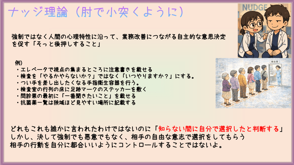 #29. ナッジ理論(肘で小突くように) 強制ではなく人間の心理特性に沿って、業務改善につながる自主的な意思決定 を促す「そっと後押しすること」 例) ・エレベータで視点の集まるところに注意書きを載せる ・検査を「やるかやらないか?」ではなく「いつやりますか?」にする。 ・つい手を差し出したくなる手指衛生容器を行う。 ・検査室の行列の床に足跡マークのステッカーを敷く ・問診票の最初に「一番聞きたいこと」を載せる ・抗菌薬一覧は狭域ほど見やすい場所に記載する どれもこれも誰かに言われたわけではないのに「知らない間に自分で選択したと判断する」 しかし、決して強制でも悪意でもなく、相手の自由な意志で選択をしてもらう 相手の行動を自分に都合いいようにコントロールすることではないよ。