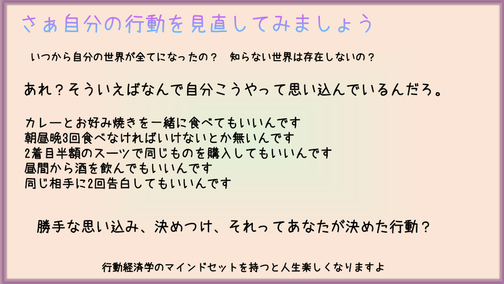 #3. さぁ自分の行動を見直してみましょう いつから自分の世界が全てになったの? 知らない世界は存在しないの? あれ?そういえばなんで自分こうやって思い込んでいるんだろ。 カレーとお好み焼きを一緒に食べてもいいんです 朝昼晩3回食べなければいけないとか無いんです 2着目半額のスーツで同じものを購入してもいいんです 昼間から酒を飲んでもいいんです 同じ相手に2回告白してもいいんです 勝手な思い込み、決めつけ、それってあなたが決めた行動? 行動経済学のマインドセットを持つと人生楽しくなりますよ