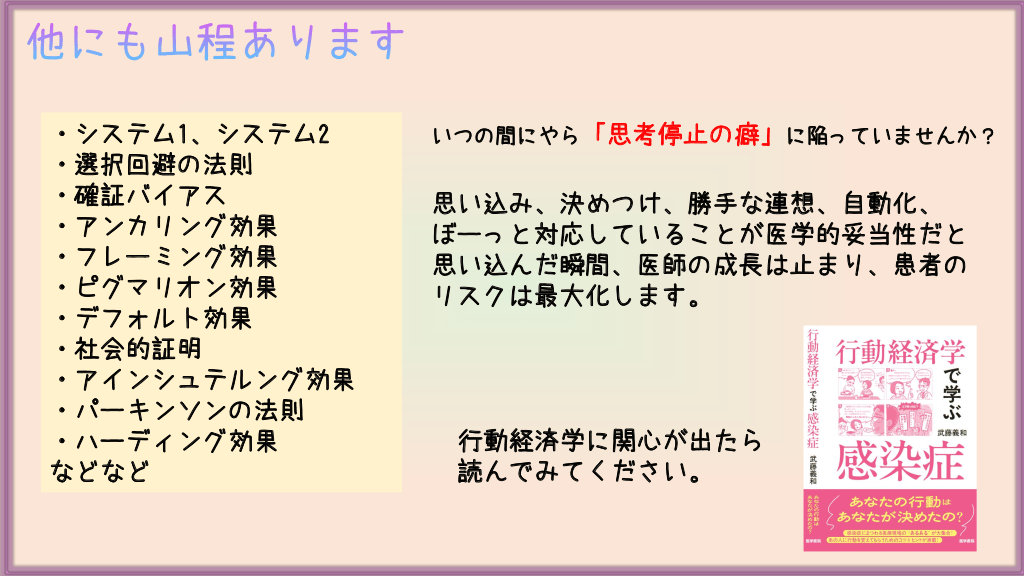 #30. 他にも山程あります ・システム1、システム2 ・選択回避の法則 ・確証バイアス ・アンカリング効果 ・フレーミング効果 ・ピグマリオン効果 ・デフォルト効果 ・社会的証明 ・アインシュテルング効果 ・パーキンソンの法則 ・ハーディング効果 などなど いつの間にやら「思考停止の癖」に陥っていませんか? 思い込み、決めつけ、勝手な連想、自動化、 ぼーっと対応していることが医学的妥当性だと 思い込んだ瞬間、医師の成長は止まり、患者の リスクは最大化します。 行動経済学に関心が出たら 読んでみてください。