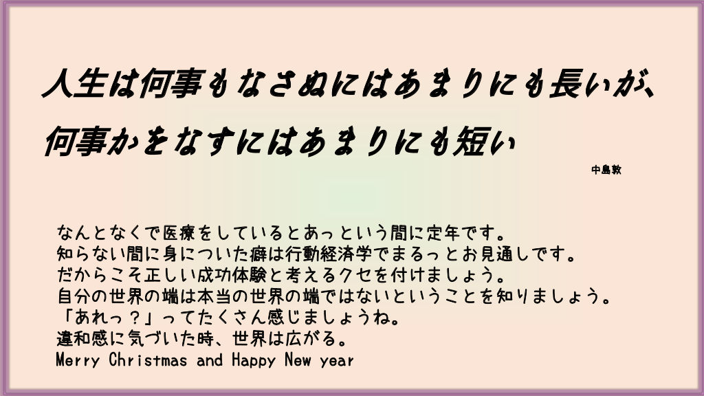 人生は何事もなさぬにはあまりにも長いが、 何事かをなすにはあまりにも短い 中島敦 なんとなくで医療をしているとあっという間に定年です。 知らない間に身についた癖は行動経済学でまるっとお見通しです。 だからこそ正しい成功体験と考えるクセを付けましょう。 自分の世界の端は本当の世界の端ではないということを知りましょう。 「あれっ?」ってたくさん感じましょうね。 違和感に気づいた時、世界は広がる。 Merry Christmas and Happy New year