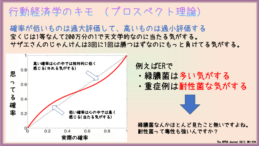 #5. 行動経済学のキモ (プロスペクト理論) 確率が低いものは過大評価して、高いものは過小評価する 宝くじは1等なんて200万分の1で天文学的なのに当たる気がする。 サザエさんのじゃんけんは3回に1回は勝つはずなのにもっと負けてる気がする。 高い確率は心の中では相対的に低く 感じる(外れる気がする) 思 っ て る 確 率 例えばERで ・緑膿菌は多い気がする ・重症例は耐性菌な気がする 低い確率は心の中では高く 感じる(当たる気がする) 緑膿菌なんかほとんど見たこと無いですよね。 耐性菌って毒性も強いんですか? 実際の確率 The APPEA Journal 52(1) 301-310