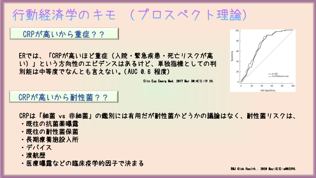 #6. 行動経済学のキモ (プロスペクト理論) CRPが高いから重症?? ERでは、「CRPが高いほど重症(入院・緊急疾患・死亡リスクが高 い)」という方向性のエビデンスはあるけど、単独指標としての判 別能は中等度でなんとも言えない。(AUC 0.6 程度) Clin Exp Emerg Med. 2017 Mar 30;4(1):19 24. CRPが高いから耐性菌?? CRPは「細菌 vs 非細菌」の鑑別には有用だが耐性菌かどうかの議論はなく、耐性菌リスクは、 ・既往の抗菌薬曝露 ・既往の耐性菌保菌 ・長期療養施設入所 ・デバイス ・渡航歴 ・医療曝露などの臨床疫学的因子で決まる BMJ Glob Health . 2020 May;5(5):e002396.