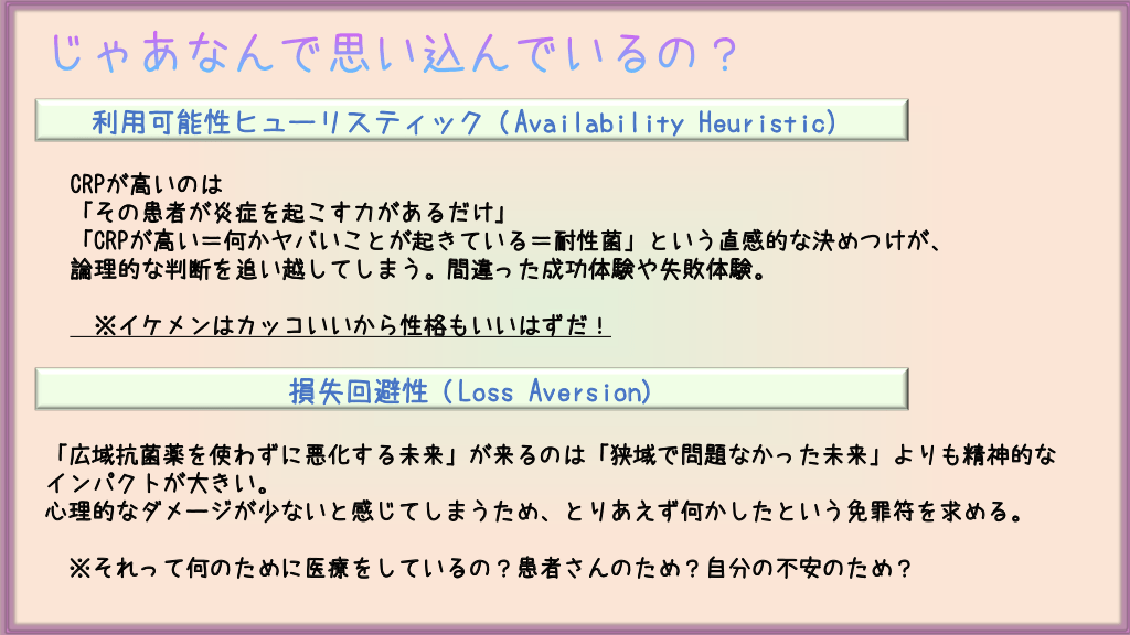#7. じゃあなんで思い込んでいるの? 利用可能性ヒューリスティック (Availability Heuristic) CRPが高いのは 「その患者が炎症を起こす力があるだけ」 「CRPが高い=何かヤバいことが起きている=耐性菌」という直感的な決めつけが、 論理的な判断を追い越してしまう。間違った成功体験や失敗体験。 ※イケメンはカッコいいから性格もいいはずだ! 損失回避性 (Loss Aversion) 「広域抗菌薬を使わずに悪化する未来」が来るのは「狭域で問題なかった未来」よりも精神的な インパクトが大きい。 心理的なダメージが少ないと感じてしまうため、とりあえず何かしたという免罪符を求める。 ※それって何のために医療をしているの?患者さんのため?自分の不安のため?