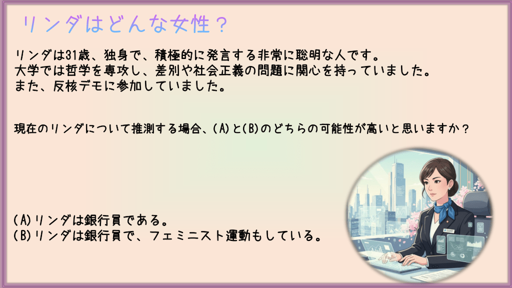 #9. リンダはどんな女性? リンダは31歳、独身で、積極的に発言する非常に聡明な人です。 大学では哲学を専攻し、差別や社会正義の問題に関心を持っていました。 また、反核デモに参加していました。 現在のリンダについて推測する場合、(A)と(B)のどちらの可能性が高いと思いますか? (A)リンダは銀行員である。 (B)リンダは銀行員で、フェミニスト運動もしている。