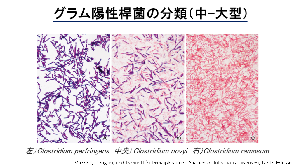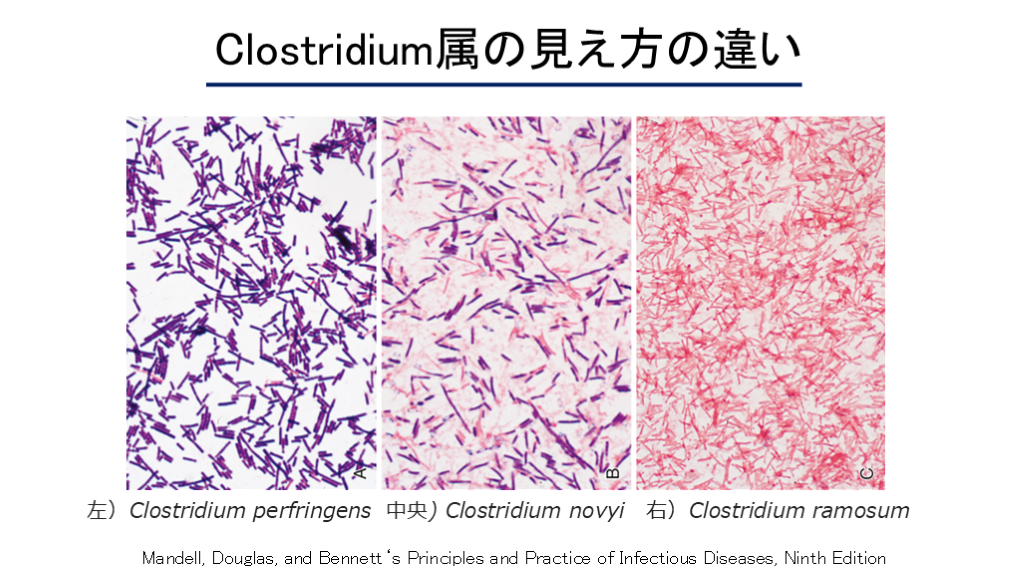 #32. 左)Clostridium perfringens 中央) Clostridium novyi 右)Clostridium ramosum Mandell, Douglas, and Bennett‘s Principles and Practice of Infectious Diseases, Ninth Edition Clostridium属の見え方の違い