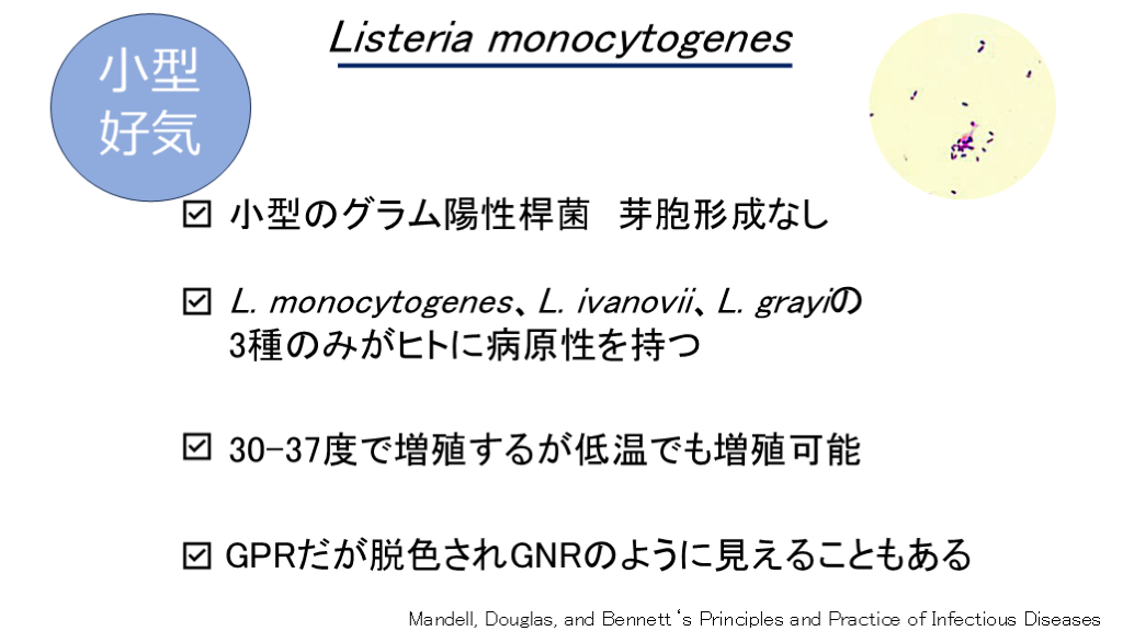 3種のみがヒトに病原性を持つ Listeria monocytogenes 小型のグラム陽性桿菌 芽胞形成なし 30-37度で増殖するが低温でも増殖可能 GPRだが脱色されGNRのように見えることもある Mandell, Douglas, and Bennett‘s Principles and Practice of Infectious Diseases 小型 好気
