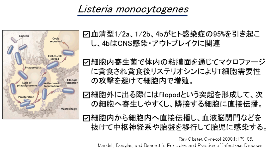 #11. Listeria monocytogenes Rev Obstet Gynecol 2008;1:179-85. 血清型1/2a、1/2b、4bがヒト感染症の95%を引き起こし、4bはCNS感染・アウトブレイクに関連 細胞内寄生菌で体内の粘膜面を通じてマクロファージに貪食され貪食後リステリオシンによりT細胞需要性の攻撃を避けて細胞内で増殖。 細胞外に出る際にはfilopodという突起を形成して、次の細胞へ寄生しやすくし、隣接する細胞に直接伝播。 細胞内から細胞内へ直接伝播し、血液脳関門などを抜けて中枢神経系や胎盤を移行して胎児に感染する。 Mandell, Douglas, and Bennett‘s Principles and Practice of Infectious Diseases