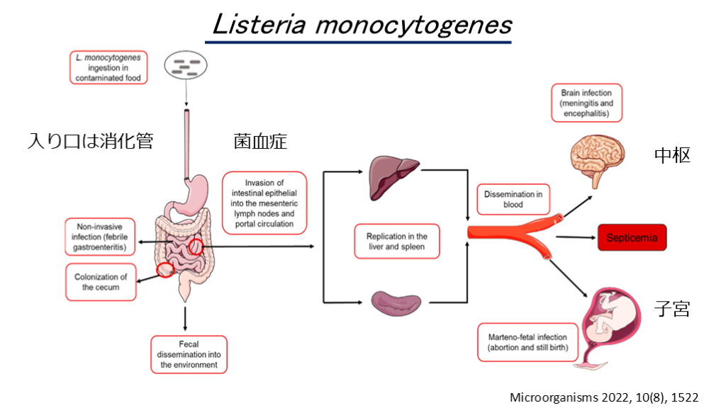 #12. Listeria monocytogenes Microorganisms 2022, 10(8), 1522 入り口は消化管 菌血症 中枢 子宮