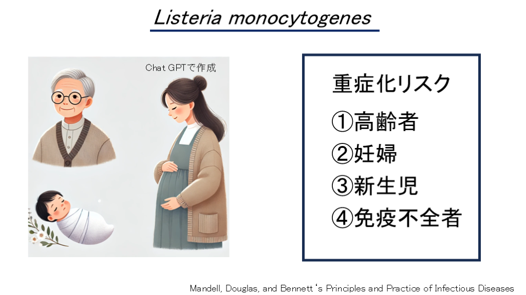 #14. Listeria monocytogenes Mandell, Douglas, and Bennett‘s Principles and Practice of Infectious Diseases Chat GPTで作成 ①高齢者 ②妊婦 ③新生児 重症化リスク ④免疫不全者