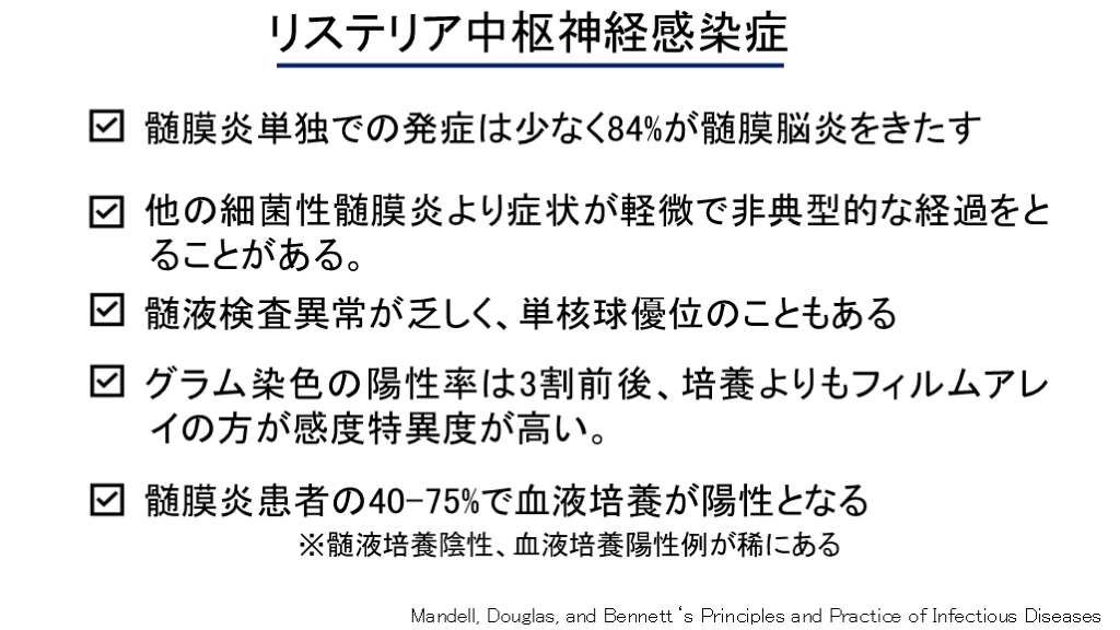 #16. Mandell, Douglas, and Bennett‘s Principles and Practice of Infectious Diseases リステリア中枢神経感染症 髄膜炎単独での発症は少なく84%が髄膜脳炎をきたす 他の細菌性髄膜炎より症状が軽微で非典型的な経過をとることがある。 髄液検査異常が乏しく、単核球優位のこともある グラム染色の陽性率は3割前後、培養よりもフィルムアレイの方が感度特異度が高い。 髄膜炎患者の40-75%で血液培養が陽性となる ※髄液培養陰性、血液培養陽性例が稀にある