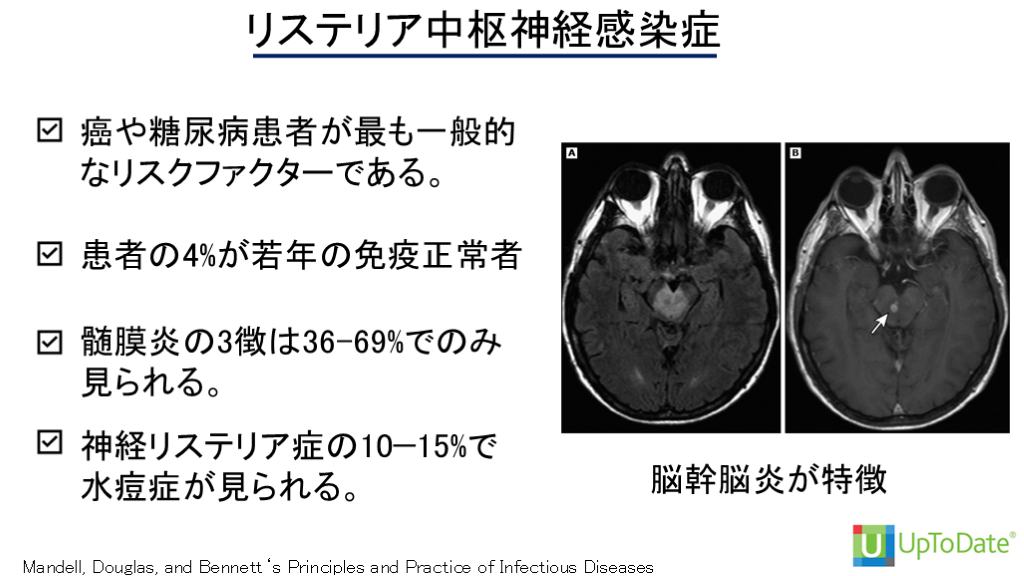 水痘症が見られる。 患者の4%が若年の免疫正常者 リステリア中枢神経感染症 Mandell, Douglas, and Bennett‘s Principles and Practice of Infectious Diseases