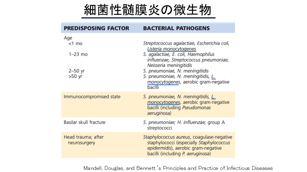 #19. Mandell, Douglas, and Bennett‘s Principles and Practice of Infectious Diseases 細菌性髄膜炎の微生物 新生児と高齢者と免疫不全患者では