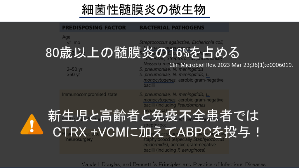 CTRX +VCMに加えてABPCを投与! 80歳以上の髄膜炎の16%を占める Clin Microbiol Rev. 2023 Mar 23;36(1):e0006019.