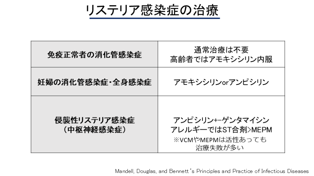 #21. Mandell, Douglas, and Bennett‘s Principles and Practice of Infectious Diseases リステリア感染症の治療 ※VCMやMEPMは活性あっても 治療失敗が多い