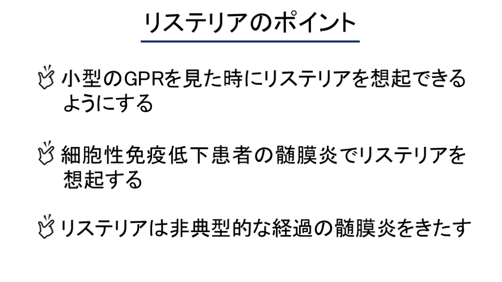 #23. 小型のGPRを見た時にリステリアを想起できるようにする 細胞性免疫低下患者の髄膜炎でリステリアを想起する リステリアは非典型的な経過の髄膜炎をきたす リステリアのポイント